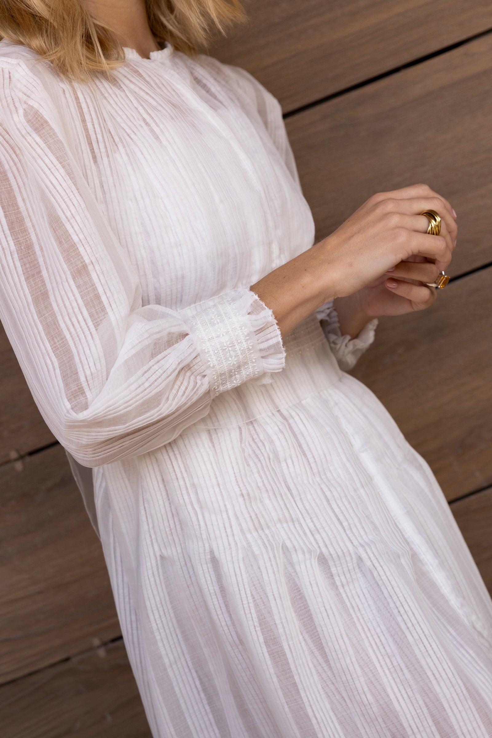 Subtle and feminine, this robe is crafted from cotton muslin with fine pintucks that join at the bodice and open into a softly flared skirt, creating a delicate, natural movement.