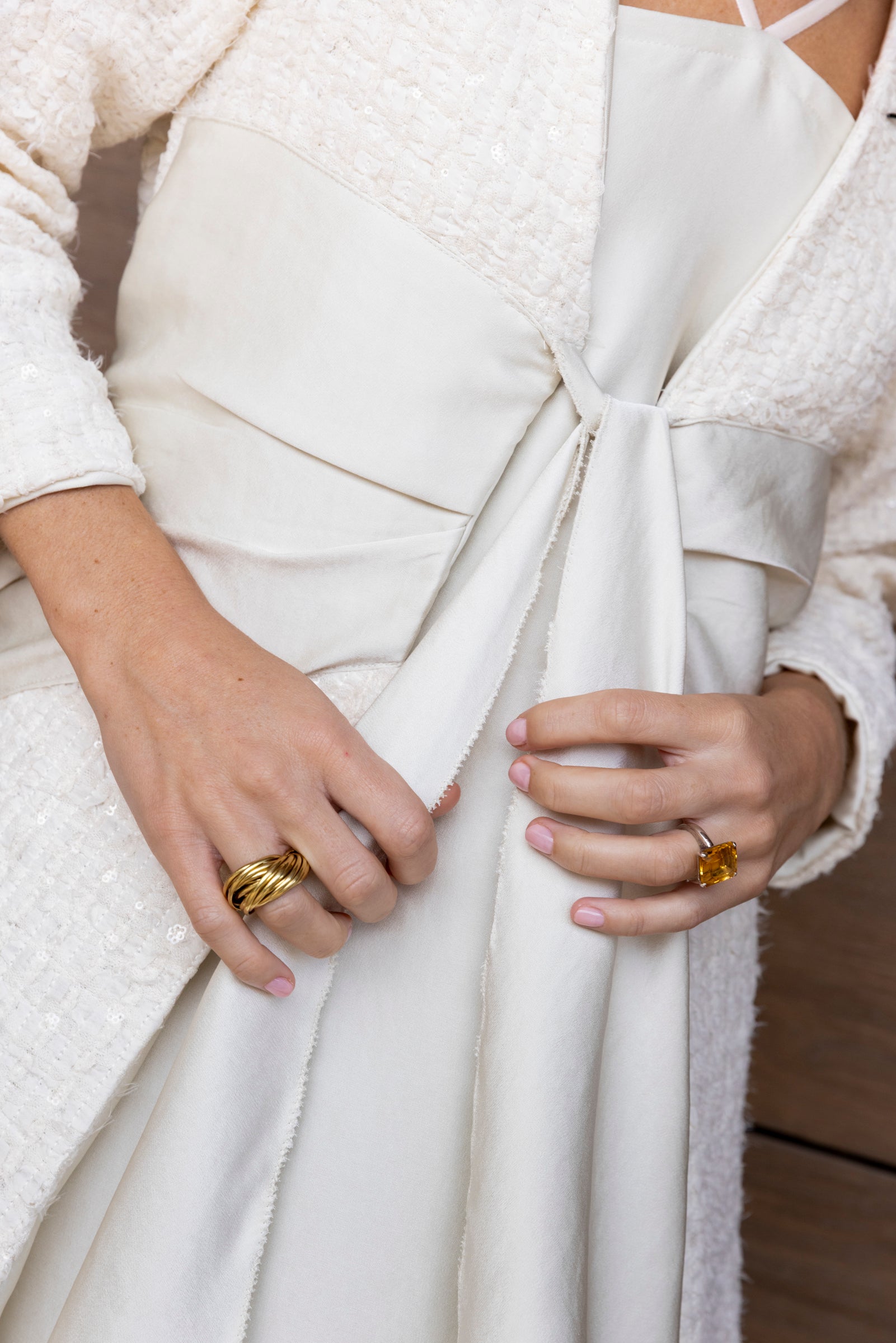 Exclusive and radiant, this robe is crafted from embroidered tulle tweed adorned with delicate ivory sequins that add a subtle, sophisticated shimmer.