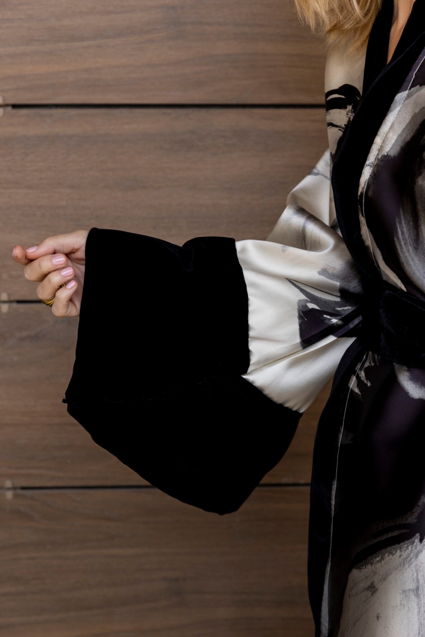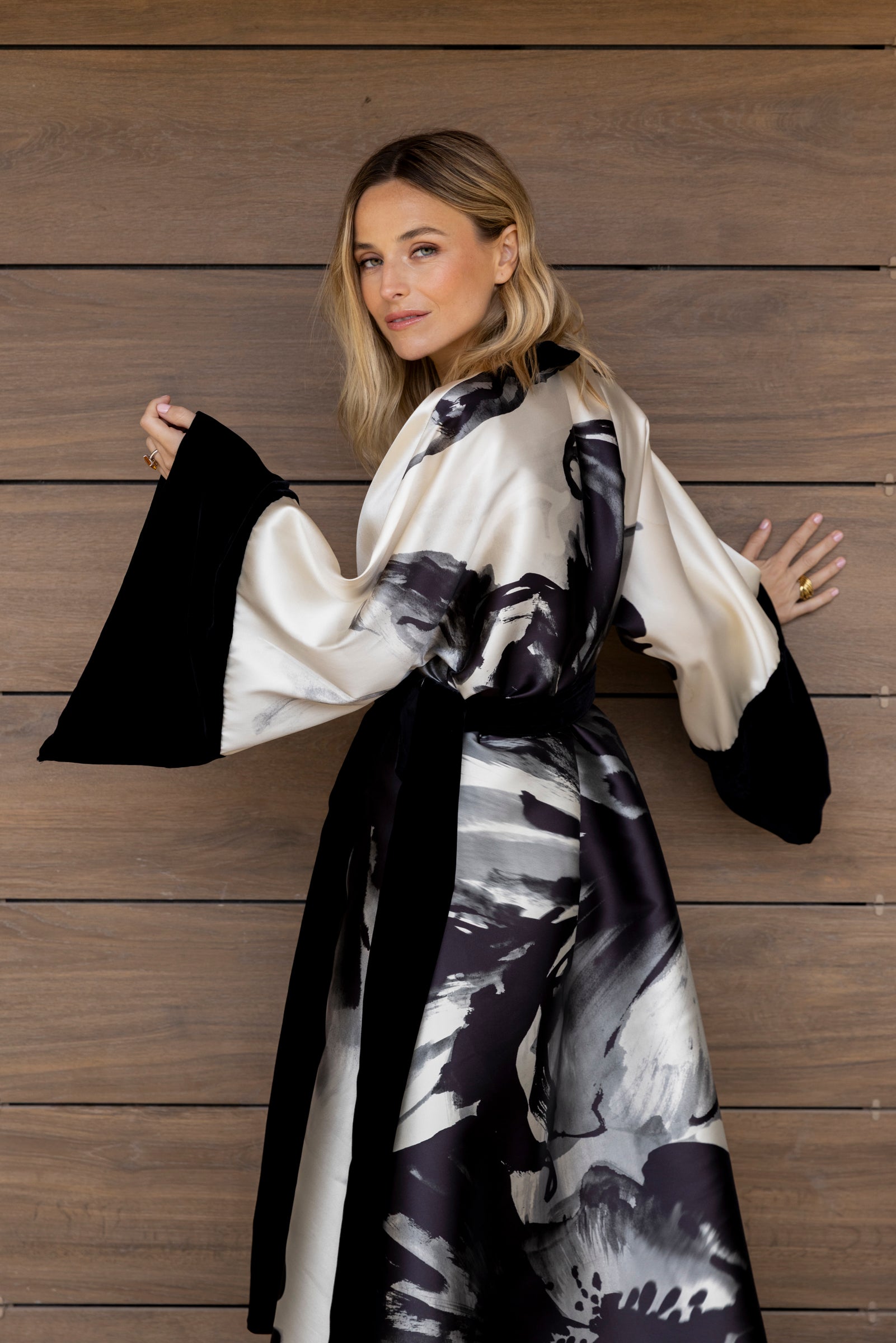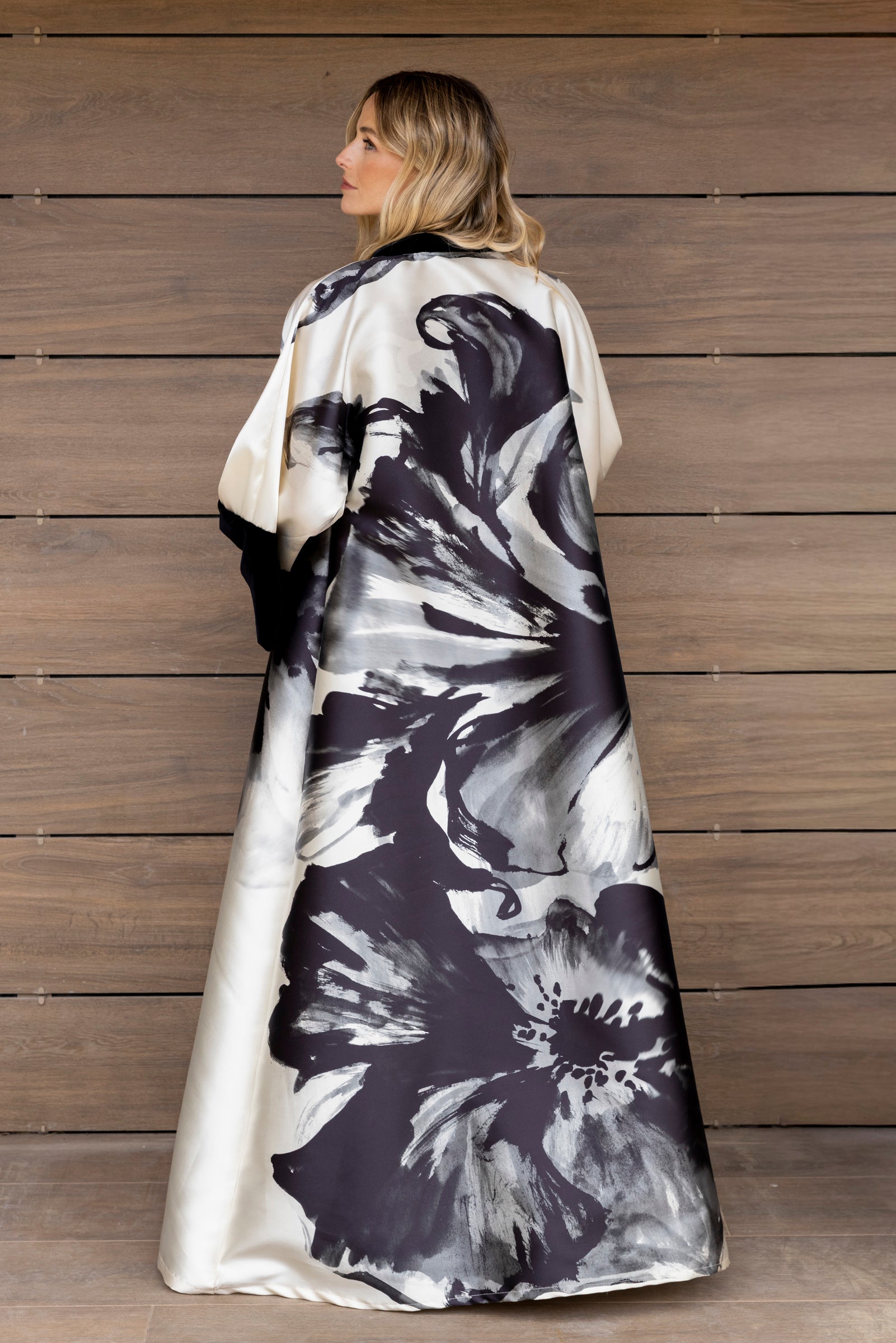 Striking and sophisticated, this kimono is crafted from mikado featuring a bold oversized black floral print that gives the piece strength and character.